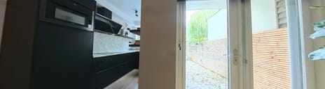 Entry into the hallway, leading to the living area at the rear with a semi-open kitchen. The kitchen is equipped with an induction hob, extractor hood, fridge-freezer combination, Quooker tap, and oven. French doors open onto the generous garden of approximately 49 m², featuring a convenient shed at the back. Behind the shed lies an additional 15 m² of municipal land. As the surrounding buildings are low-rise, the garden enjoys sunlight throughout the day.