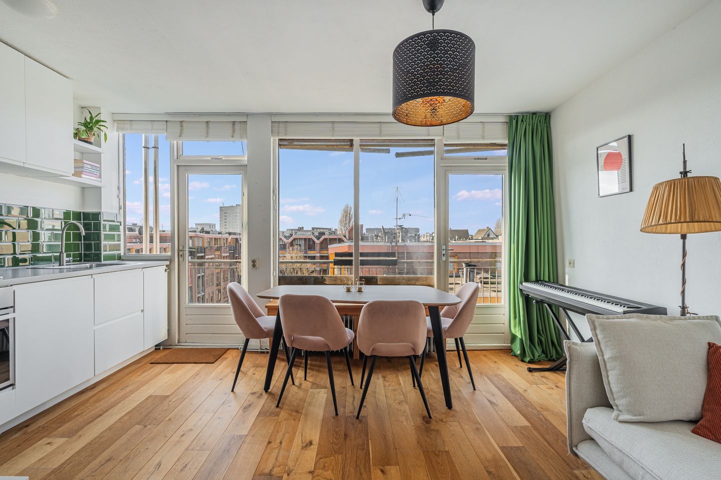 Entree op de vierde verdieping met toegang tot de ruime en lichte woonkamer. Het eikenhouten lamelparket biedt een warme sfeer door de gehele woning. Open keuken met een gaskookplaat, afzuigkap, koel/vriescombinatie, oven en een vaatwasser. Badkamer met een douche, wastafel en een WC. Praktische bergkast met aansluiting voor de wasmachine. Vanuit de woonkamer heb je toegang tot het brede en zonnige balkon met zonnescherm die wijd uitkijkt over de binnentuin. De slaapkamer beschikt over ruime inbouwkasten en lichtkoepel met rolgordijn.