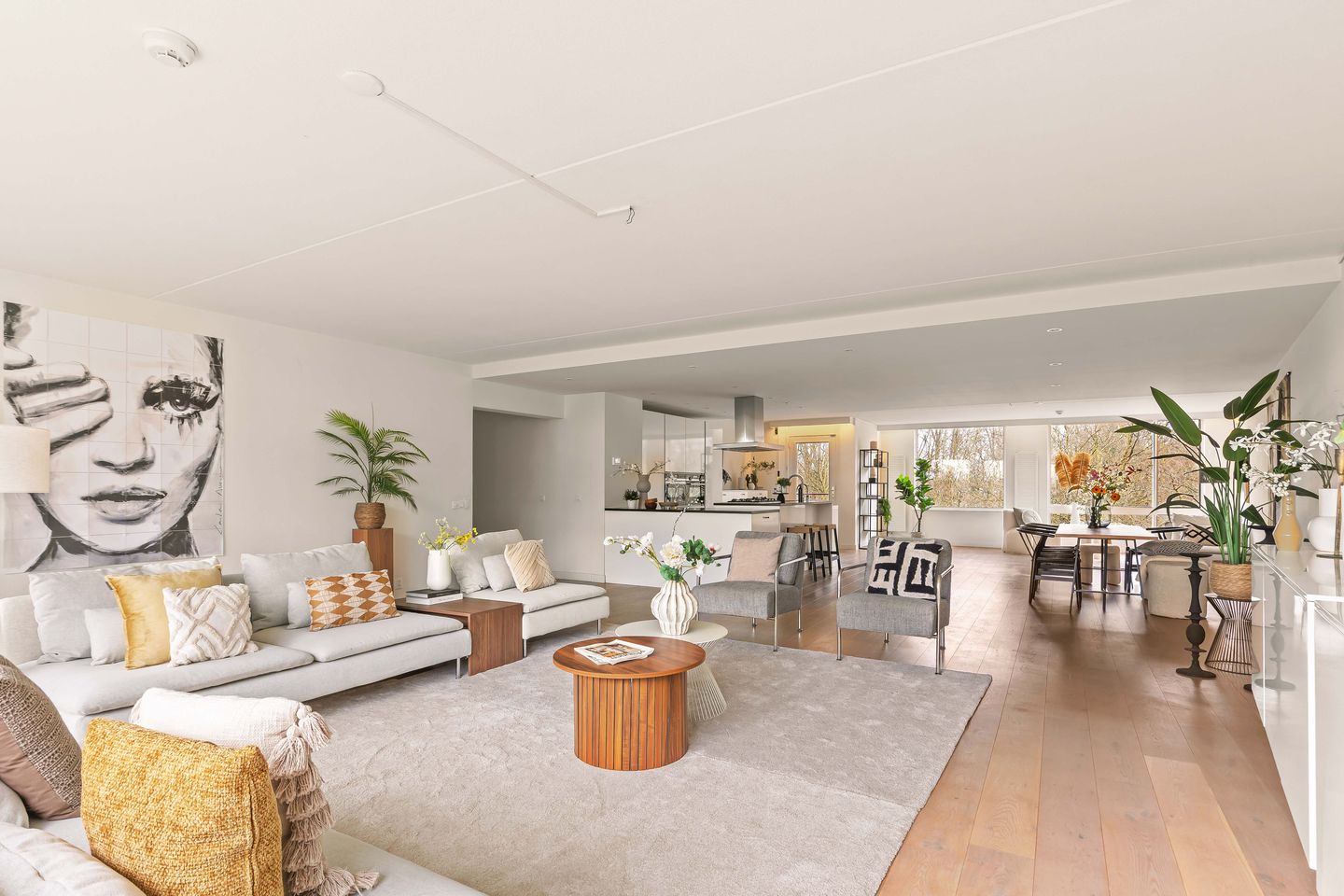 The impressive living room extends across the entire width of the apartment and is characterized by large windows that provide beautiful light and unobstructed views of the surrounding greenery. The space is generous enough for a comfortable sitting area and a large dining table. Centrally located in the living area is the modern, U-shaped kitchen with cooking island and cozy breakfast bar. The kitchen is equipped with various built-in appliances (including a Quooker, dishwasher, and oven) and has more than enough storage space.