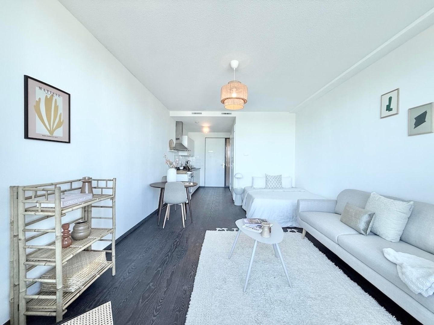 Situated on the 5th floor, this well-organised studio is accessible via two elevators and designed for maximum functionality. The open-plan living and sleeping area is filled with natural light thanks to its west-facing loggia – a perfect spot to relax in the afternoon sun. The sleek modern kitchen is equipped with built-in appliances and ample storage. The bathroom features a shower, toilet, and sink with modern fittings. Comfort is assured year-round with underfloor heating and cooling, powered by district heating. Additional features include double glazing, a video intercom system, and access to fiber-optic internet. Residents also have access to secure bicycle storage within the building. A daytime caretaker (huismeester) is present to assist with daily needs. In addition to the apartment, there is a private storage room of 6 m², located within the building. This separate storage unit is offered for €12,500.