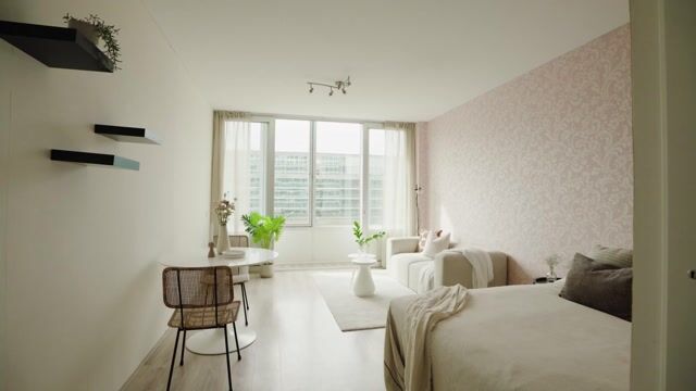 Het betreft een studio, waarbij wonen en slapen in één open ruimte samenkomen. Hierdoor kun je de indeling helemaal naar eigen wens invullen en optimaal gebruikmaken van de beschikbare ruimte. In de badkamer is een douche, wastafel en toilet. Alles is verzorgd en functioneel.