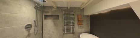 - Dubbele wastafel, inloopdouche, ligbad, toilet, en wastafelmeubel