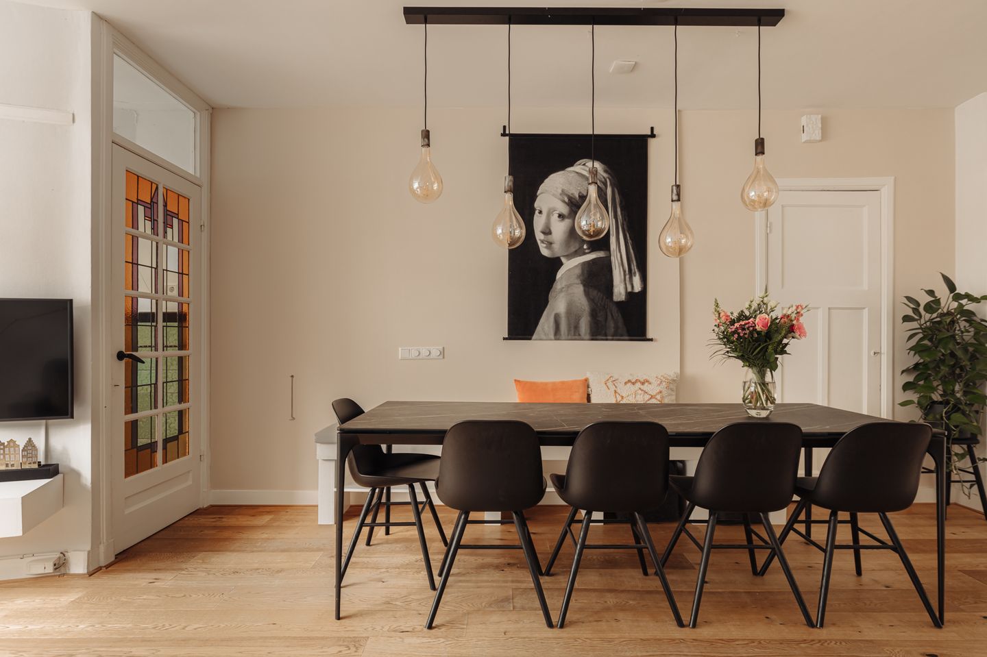 De leefruimte aan de voorzijde wordt gedragen door de erker — een uitkijkpost op de straat, waar het licht prachtig binnenvalt. Hier is ruimte voor een royale zithoek, die beschut ligt en tegelijk verbonden is met de straat via de hoge ramen. Aan de andere zijde van de ruimte staat een lange eettafel als centraal ankerpunt. De glas-in-looddeur en de lichtval maken deze plek uitgesproken geschikt voor diners, spelavonden of lang natafelen. De houten vloer loopt in één lijn door van voor tot achter en benadrukt de lengte van de woning, terwijl het kleurenpalet van zachte wit- en zandtonen het huis een geheel maakt.