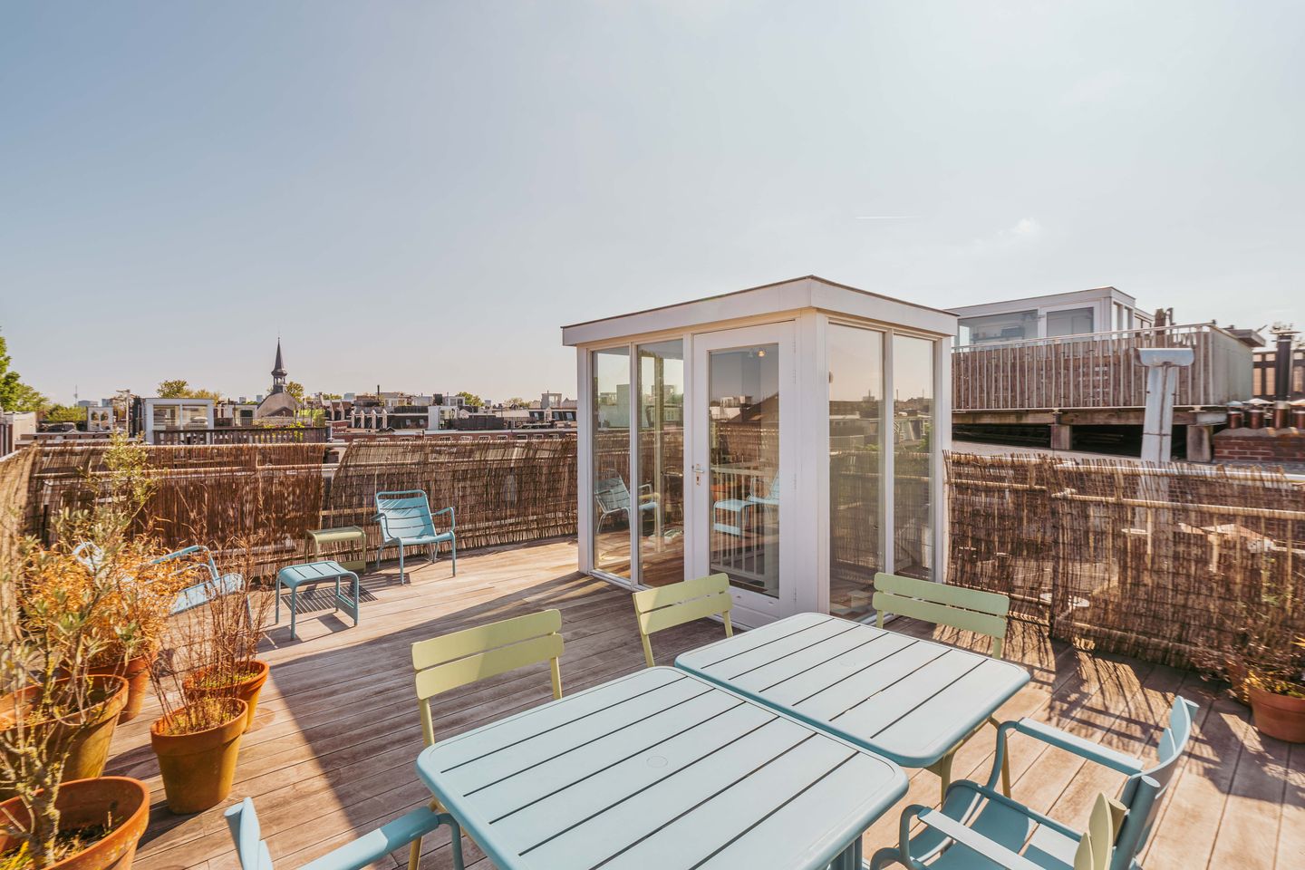 The stairs then lead up to the kitchenette on the roof (which has a sink, running water, and a fridge). The roof terrace itself is about 34m² in area. It was built in 2011, with planning permission. It affords stunning views of the surrounding area and the sun shines here all day.