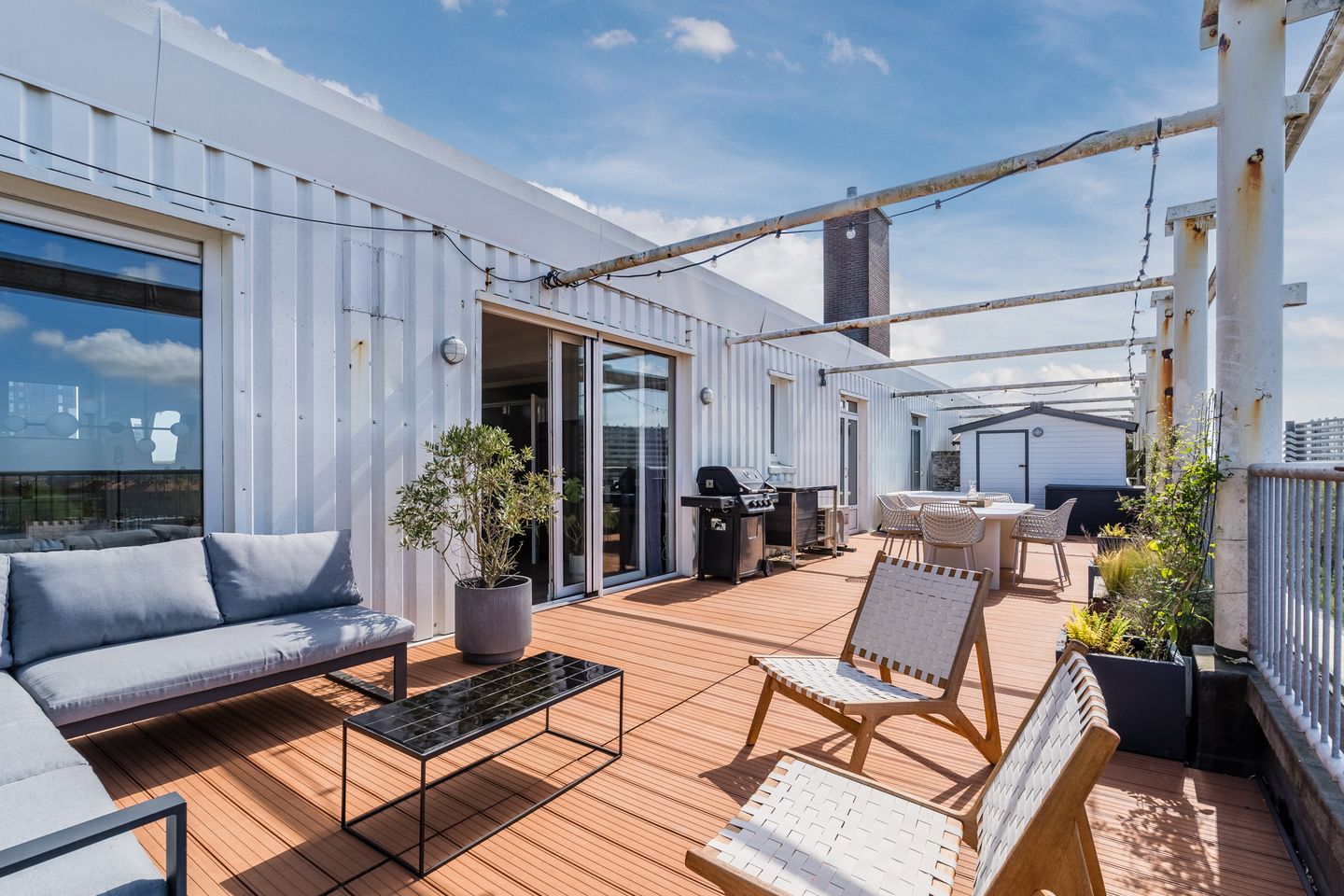 Een absoluut hoogtepunt is het royale dakterras. Dit zonnige terras is netjes aangelegd met vlonderplanken van kunststof en biedt ruimte voor zowel een eethoek als loungegedeelte. En wat een uitzicht heb je hier! Hier kun je heerlijk relaxen, zonnebaden of barbecueën. Het is een werkelijk unieke plek om van het buitenleven te genieten. Daarnaast is er een praktische berging aanwezig voor het opbergen van spullen.