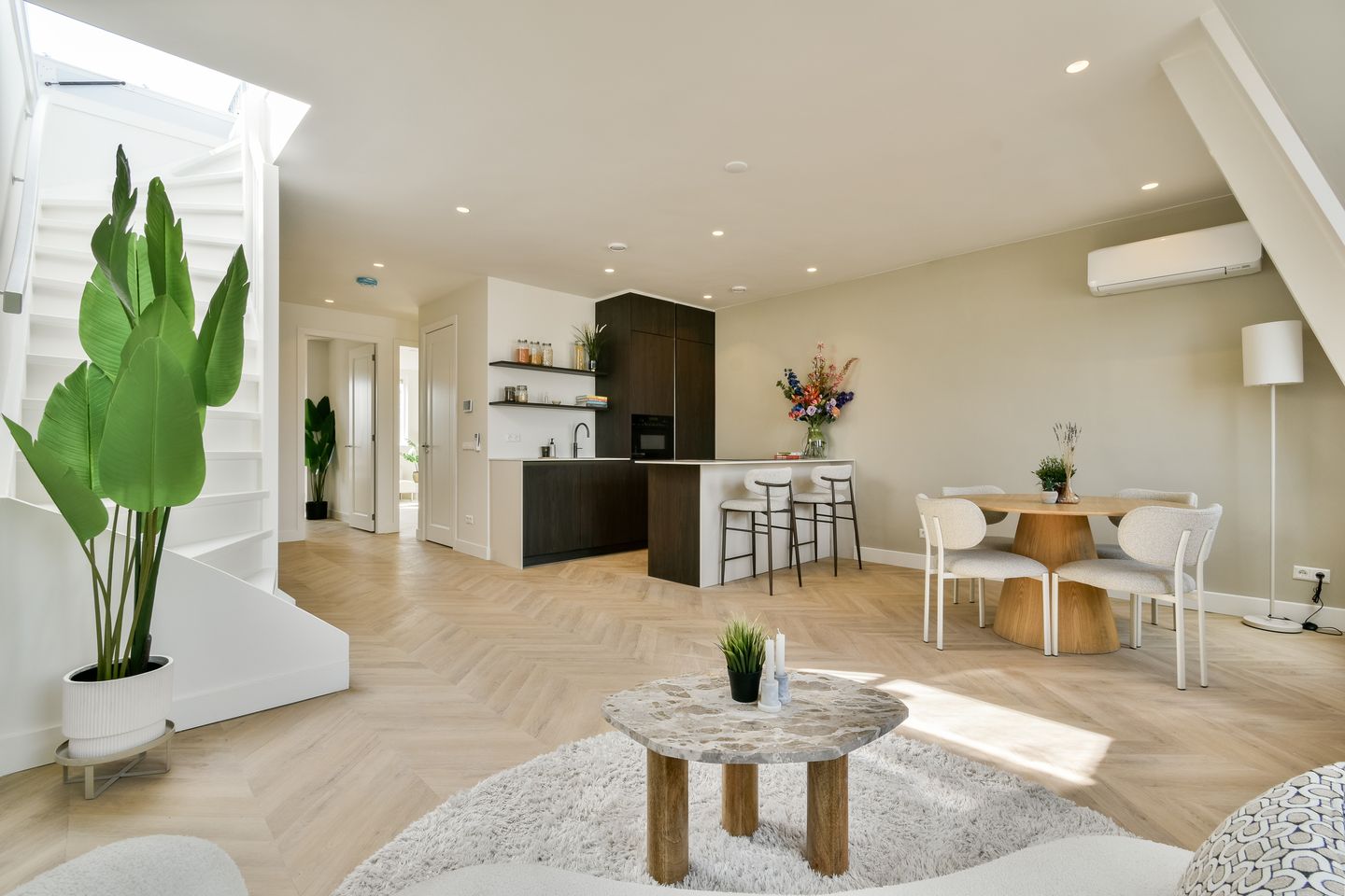 On the fourth floor, you will find the bright and spacious living level. The living room with open kitchen forms the heart of the home and feels spacious and comfortable thanks to the open layout. Large windows provide plenty of natural light and a pleasant atmosphere. The open kitchen is modern and seamlessly connects to the living space. It has a sleek, contemporary design with a combination of light cabinetry and a dark countertop, creating an attractive contrast.