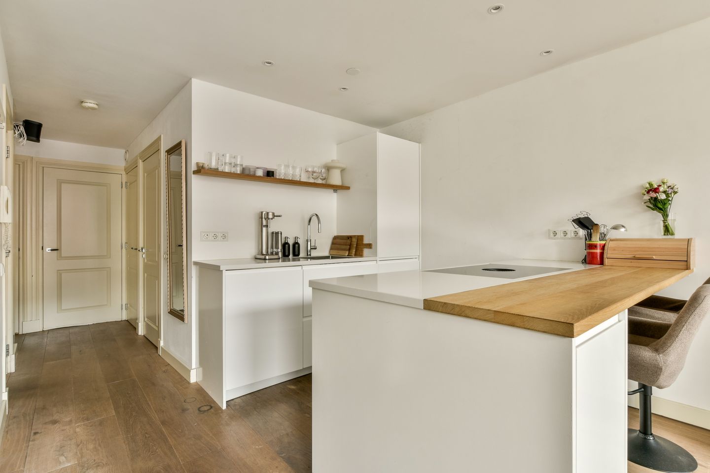 Aan de voorzijde ligt de lichte woonkamer met grote raampartijen en openslaande deuren naar een Frans balkon. De open keuken in witte hoogglans is voorzien van moderne inbouwapparatuur, waaronder een vaatwasser, combimagnetron/oven en een ruim hardstenen werkblad. De indeling maakt het een fijne plek om te koken, te borrelen en te ontspannen.