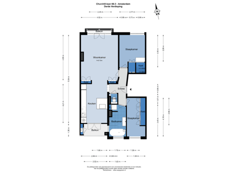 De entree bevindt zich aan de Churchill-laan en geeft via het gezamenlijke trappenhuis toegang tot de derde verdieping. Bij binnenkomst in de woning leidt de centrale hal naar alle vertrekken. Aan de voorzijde bevindt zich de eerste slaapkamer, evenals de ruime en lichte doorzon woonkamer met een open verbinding naar de keuken. Aan de achterzijde bevindt zich de tweede slaapkamer, de badkamer en de moderne open keuken. De luxueuze keuken is voorzien van diverse inbouwapparatuur en is een 'eyecatcher'. Zowel vanuit de keuken als vanuit de woonkamer is een balkon bereikbaar. De woning beschikt over een fraaie badkamer voorzien van ligbad, inloopdouche en aansluiting voor de wasmachine en droger. Het toilet bevindt zich separaat in de hal. Daarnaast is er een zeer ruime berging op de zolderverdieping, voorzien van elektra en daglicht en de mogelijkheid om eventueel een dakterras te realiseren.