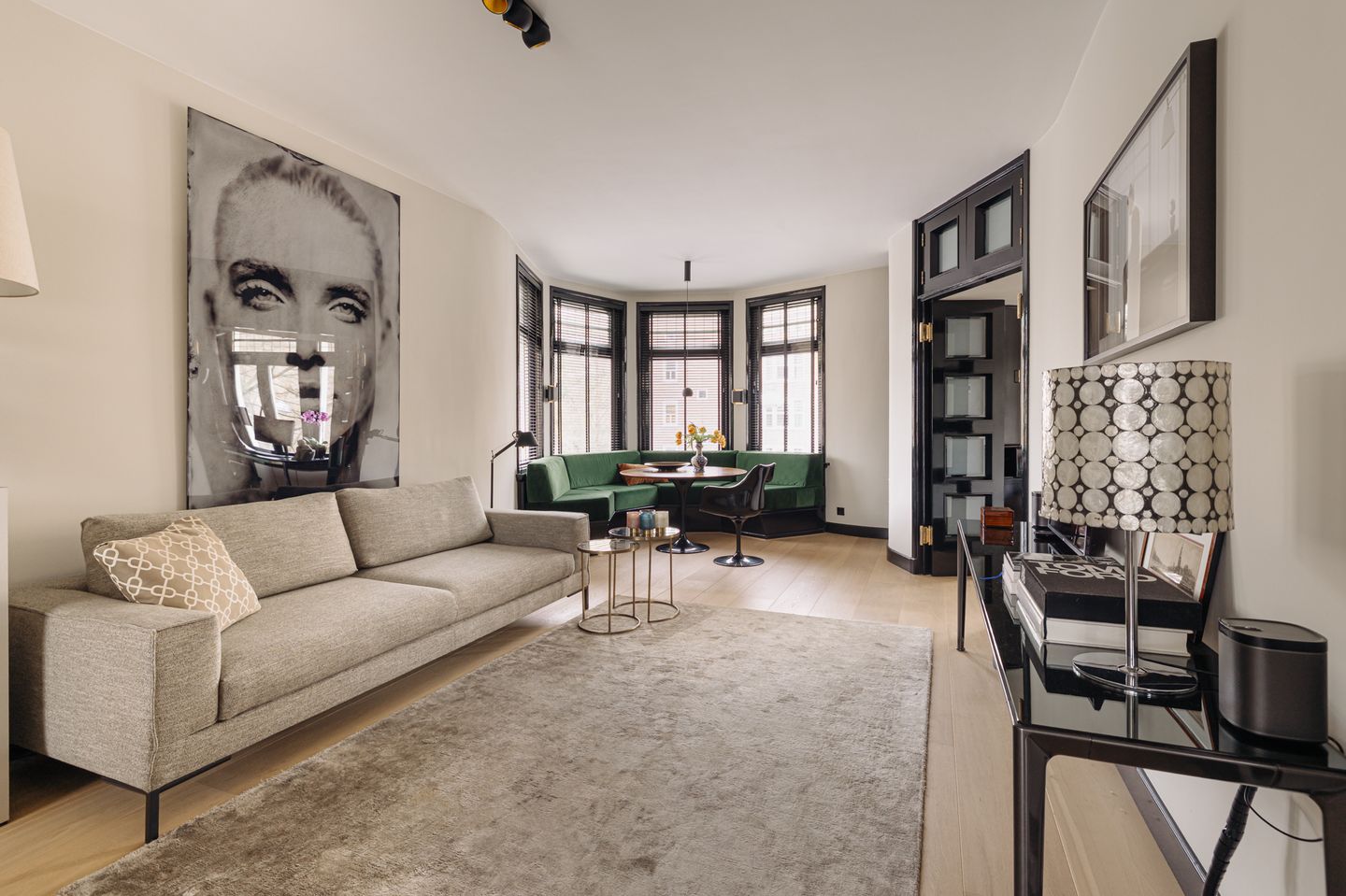 At the centre lies the sitting area, which offers a slightly more sheltered atmosphere, ideal for relaxed evenings. At the front, the elegant bay window forms the endpoint of the space. A built-in bench follows the curve of the façade, creating a comfortable seating area with views onto the street, where the evening light enters beautifully.