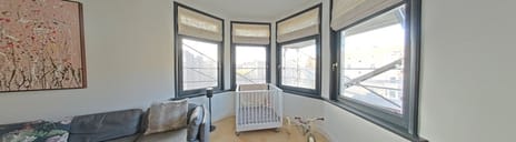The fourth floor comprises three good-sized bedrooms, a bathroom, and a separate toilet. The first bedroom opens directly onto the roof terrace and has built-in wardrobes. Two more rooms are located at the front of the house; The master bedroom once again features a beautiful bay window with plenty of natural light and a view of the street.