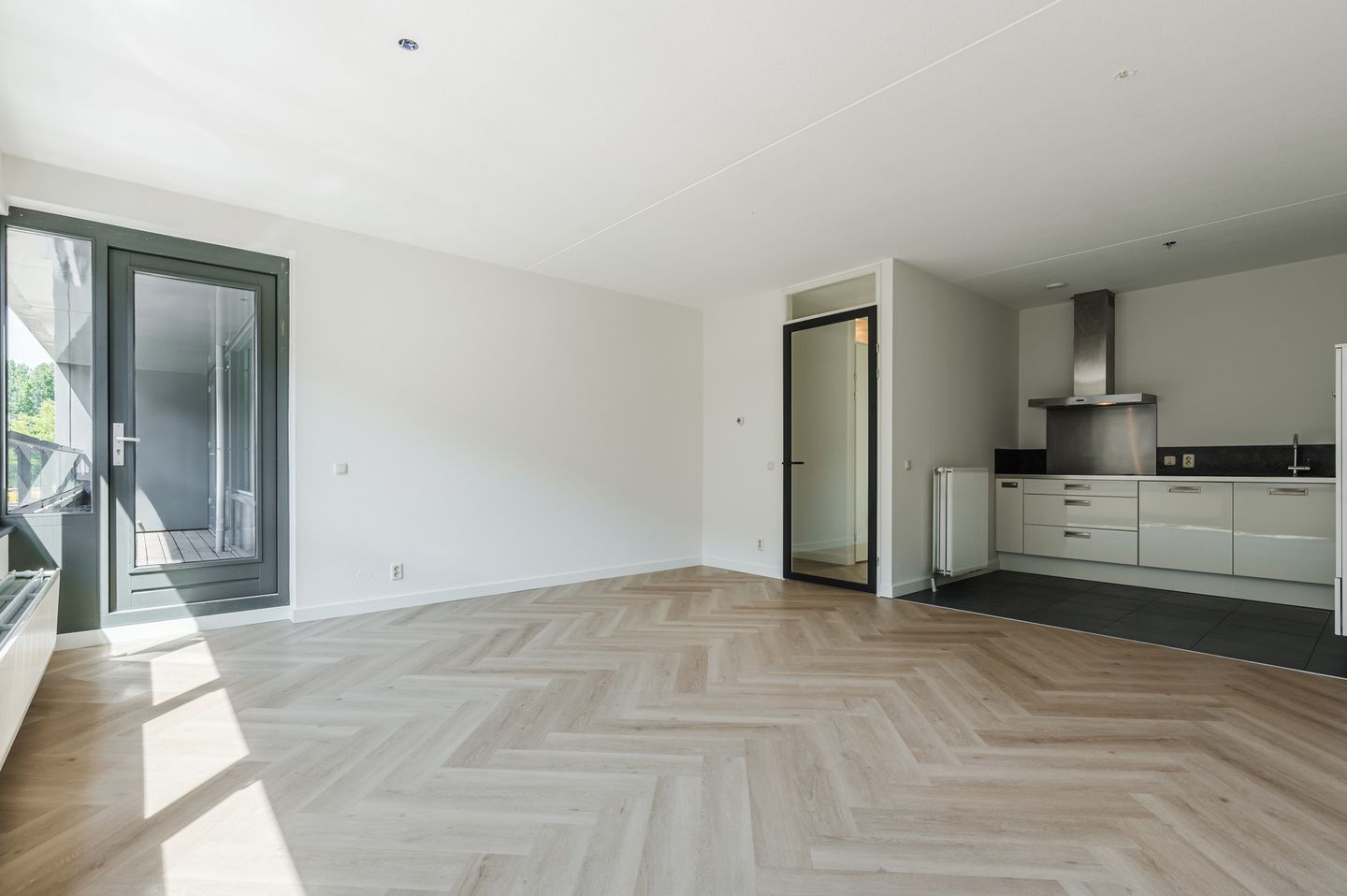 The entire house is finished with a light oak PVC herringbone floor with new 9 cm high white skirting boards and a tiled floor in the kitchen.