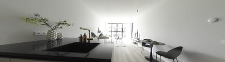 Entrance to the house, spacious hall with access to the separate toilet room with washbasin and which is equipped with luxurious tiling, extensive meter cupboard with fiber optic, boiler room with washing machine connection, W.K.O unit and WTW system. Through the black steel door you can enter the bright living room which has an apartment-wide glass facade that overlooks the green (yet to be constructed) courtyard. The loggia is accessible via the living room and bedroom and has beautiful accordion windows, which you can open completely. Lovely covered seating and still being outside!