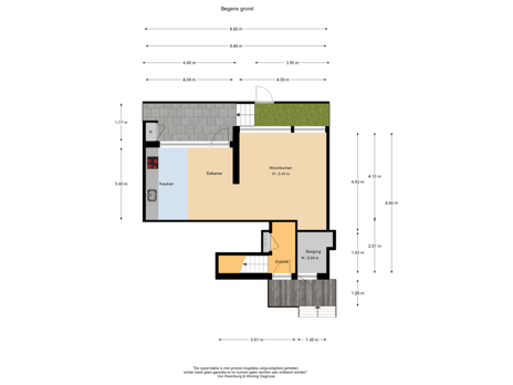 - 8 m² (4,40 meter diep en 1,77 meter breed)