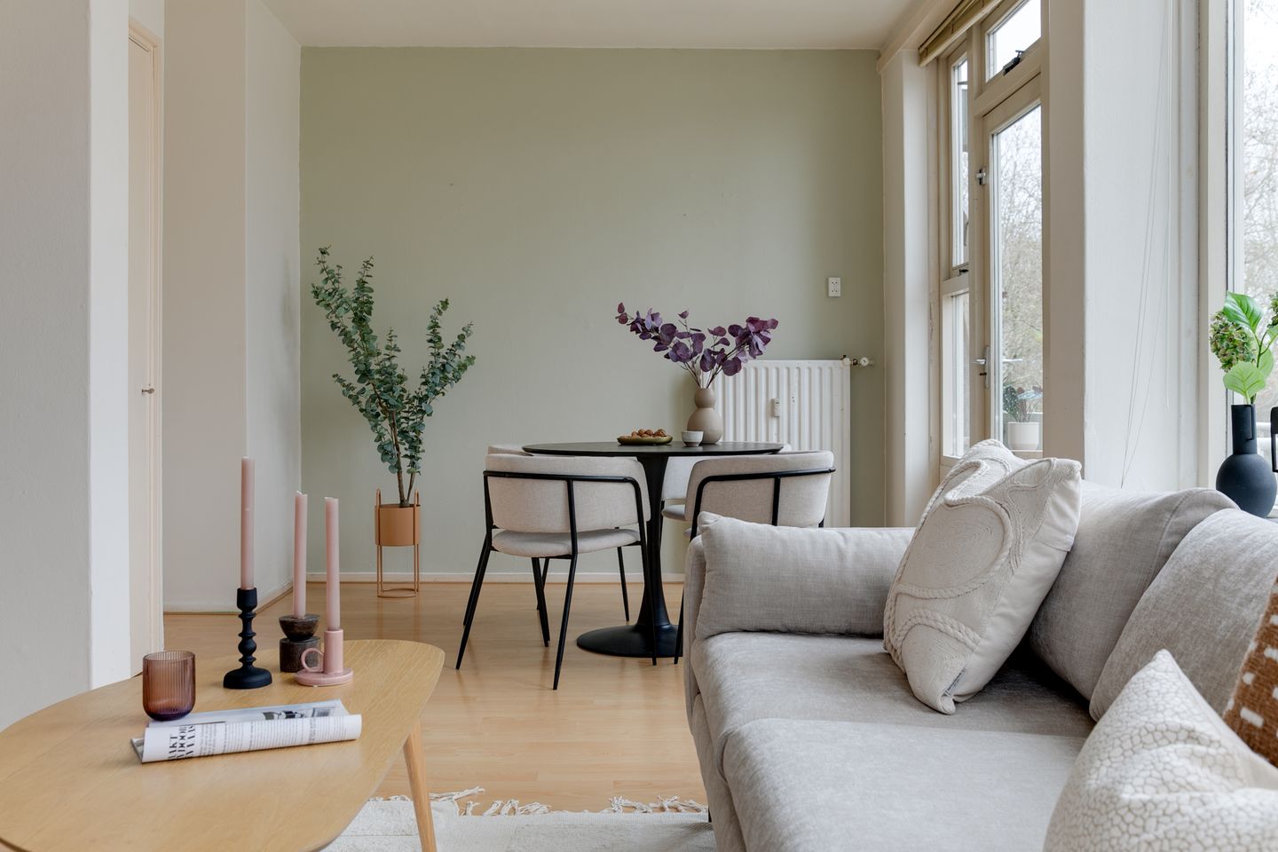 De royale zitkamer met eetgedeelte, gelegen op de hoek, profiteert van veel lichtinval dankzij de gunstige ligging en grote raampartijen. Aan de andere zijde van het appartement bevinden zich twee riante slaapkamers. Eén slaapkamer is voorzien van een ingebouwde kledingkast, terwijl de tweede slaapkamer directe toegang heeft tot de badkamer. De badkamer is uitgerust met een ligbad, wastafel en toilet.
