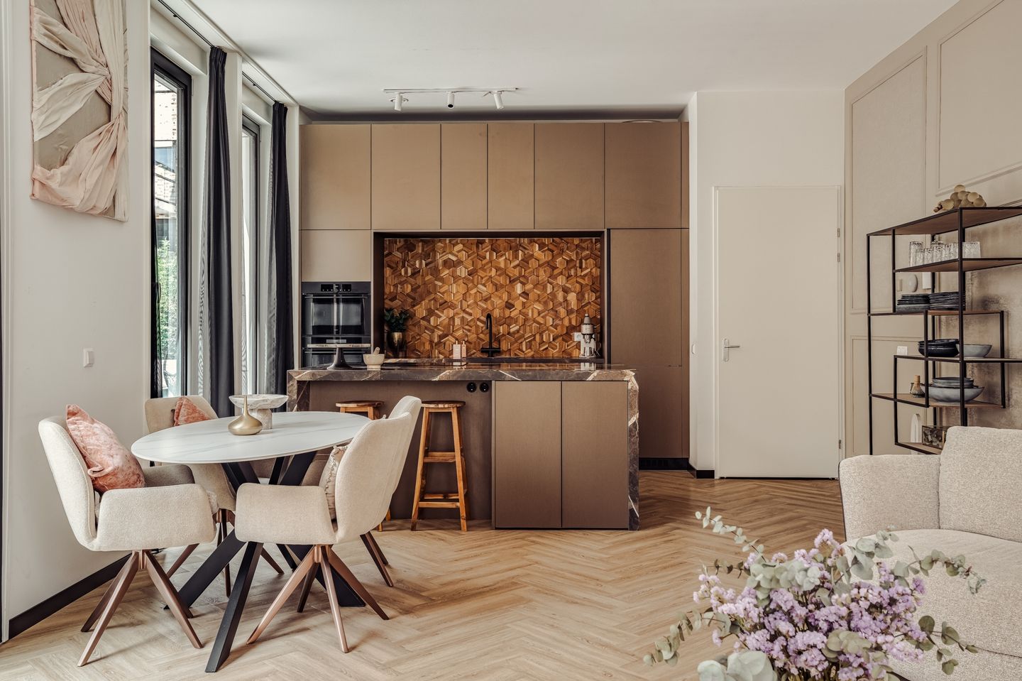 ?De keuken is een waar pronkstuk: een ruim kookeiland met een stijlvol marmeren blad, Quooker, inductie met inbouw afzuiging, aparte vaatwasser en koelkast en vriezer én een apart werkblad voor je koffiehoek. Een droomkeuken voor de thuiskok én de koffieliefhebber.