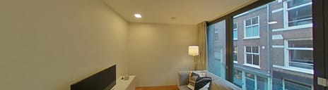 Upon arrival, the distinctive character of the building immediately stands out compared to the surrounding properties: a modern complex surrounded among the characteristic Jordaan houses. Via the staircase in the general entrance you reach the front door of the apartment. In the hall, directly on the right-hand side, you will find the bathroom with shower, toilet, radiator and washbasin. At the rear is the bedroom, with sliding doors giving access to the terrace of approximately 12 m2, a private spot in the heart of the Jordaan where you can enjoy the outdoors.