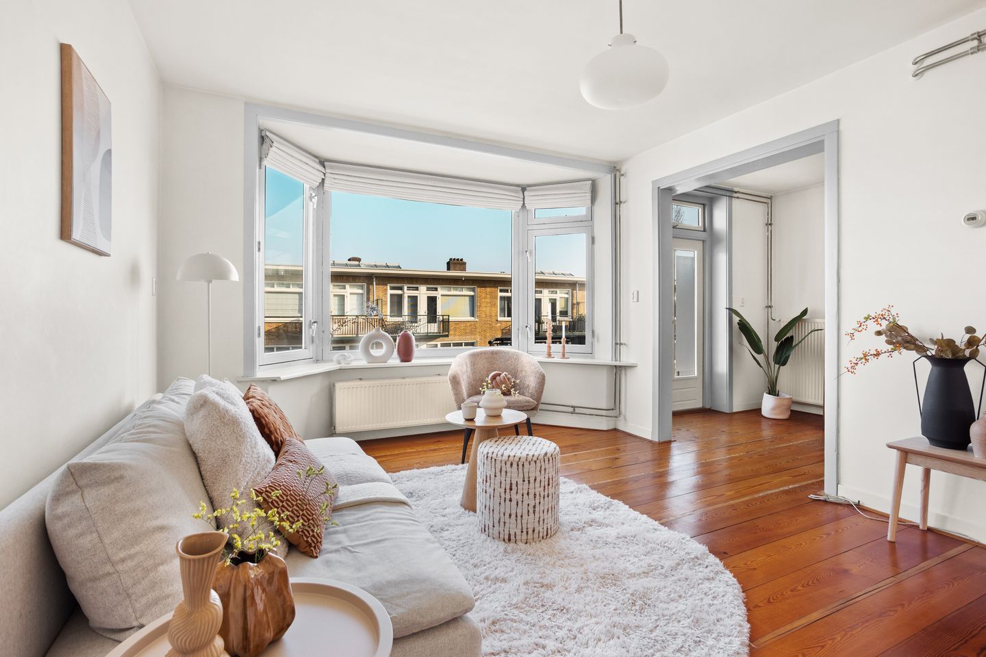 Via het trappenhuis bereik je de voordeur van de woning op de derde verdieping. Je komt binnen in de hal, die toegang biedt tot alle vertrekken.