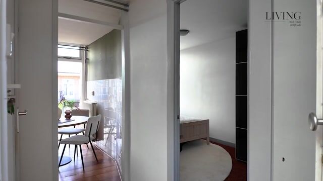 The bedroom, adjacent to the kitchen, comfortably accommodates a double bed and is connected to the balcony via French doors. There is also space for a large wardrobe, and the room features a (walk-in) closet with sliding doors.