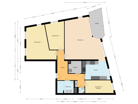 In de woning loop je via de hal langs de 2 royale slaapkamers door naar de woonkamer en keuken. De rechtergang leidt eveneens naar de keuken en de 3e slaapkamer.