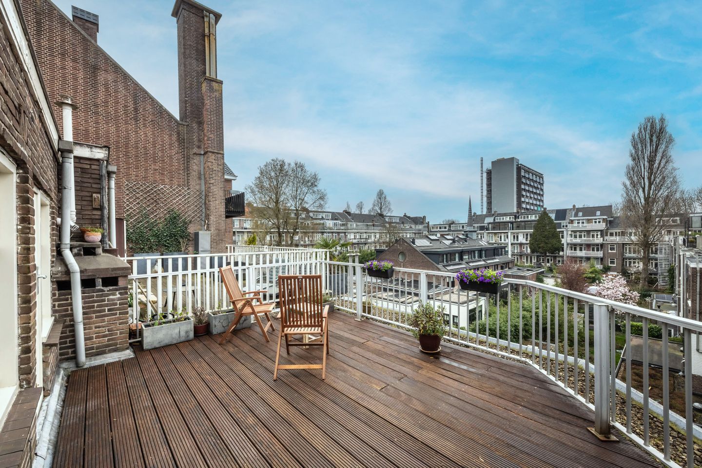 3e etage: Ruime en lichte trap en overloop. Op deze etage bevinden zich 2 ruime slaapkamers met hoge plafonds, een fraai afgewerkte en moderne badkamer met separate douche, bad, handdoekradiator en dubbele wastafel. Door de deur aan de achterzijde bevindt zich het prachtige dakterras (20,8m2). Door de diepte van het terras is er vanaf april tot september zon. Ook is er nog een prettige schaduwstrook voor de warme dagen in de zomer.