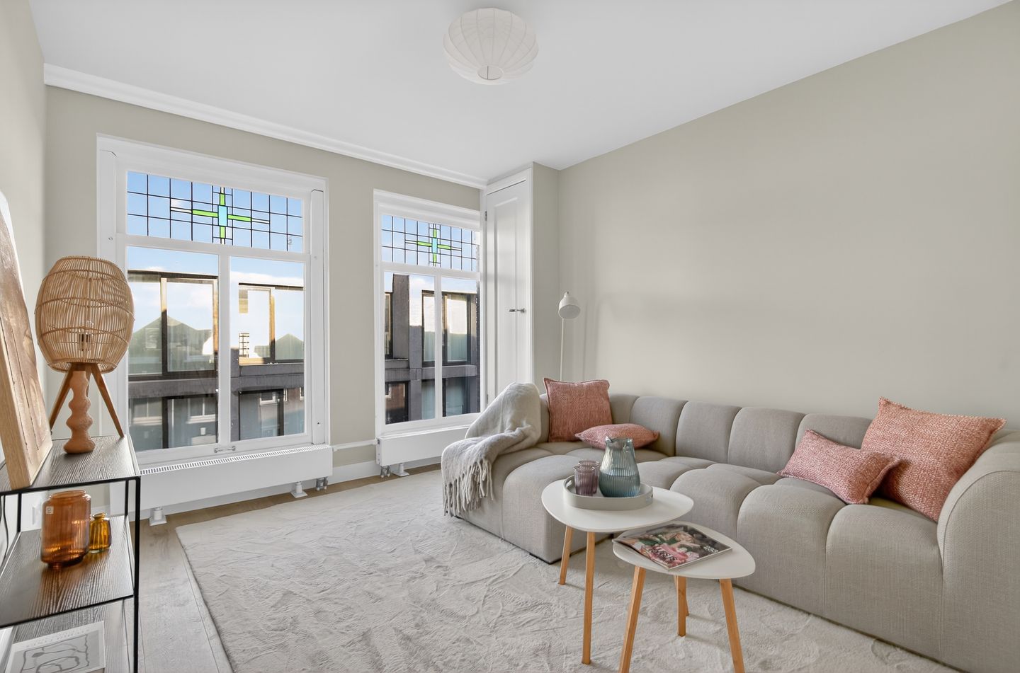 Op de derde verdieping bevindt zich de prachtige, lichte woonkamer die van voor tot achter doorloopt. De grote ramen aan de voorzijde zorgen voor een zee aan daglicht en zijn voorzien van sfeervolle glas-in-lood details, wat het appartement een authentiek Amsterdams karakter geeft.