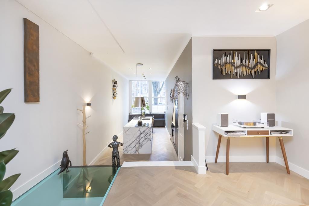 Bij binnenkomst via het bordes met zitbank, betreed je de gemeenschappelijke entree. De hal, met zijn originele marmeren lambrisering, leidt naar de toegangsdeur op de begane grond. De eerste indruk is meteen verbluffend: een prachtig marmeren kookeiland, beloopbaar glas dat het souterrain verbindt met de woonverdieping, fraaie afwerking inclusief luxe wand- en plafondspots.