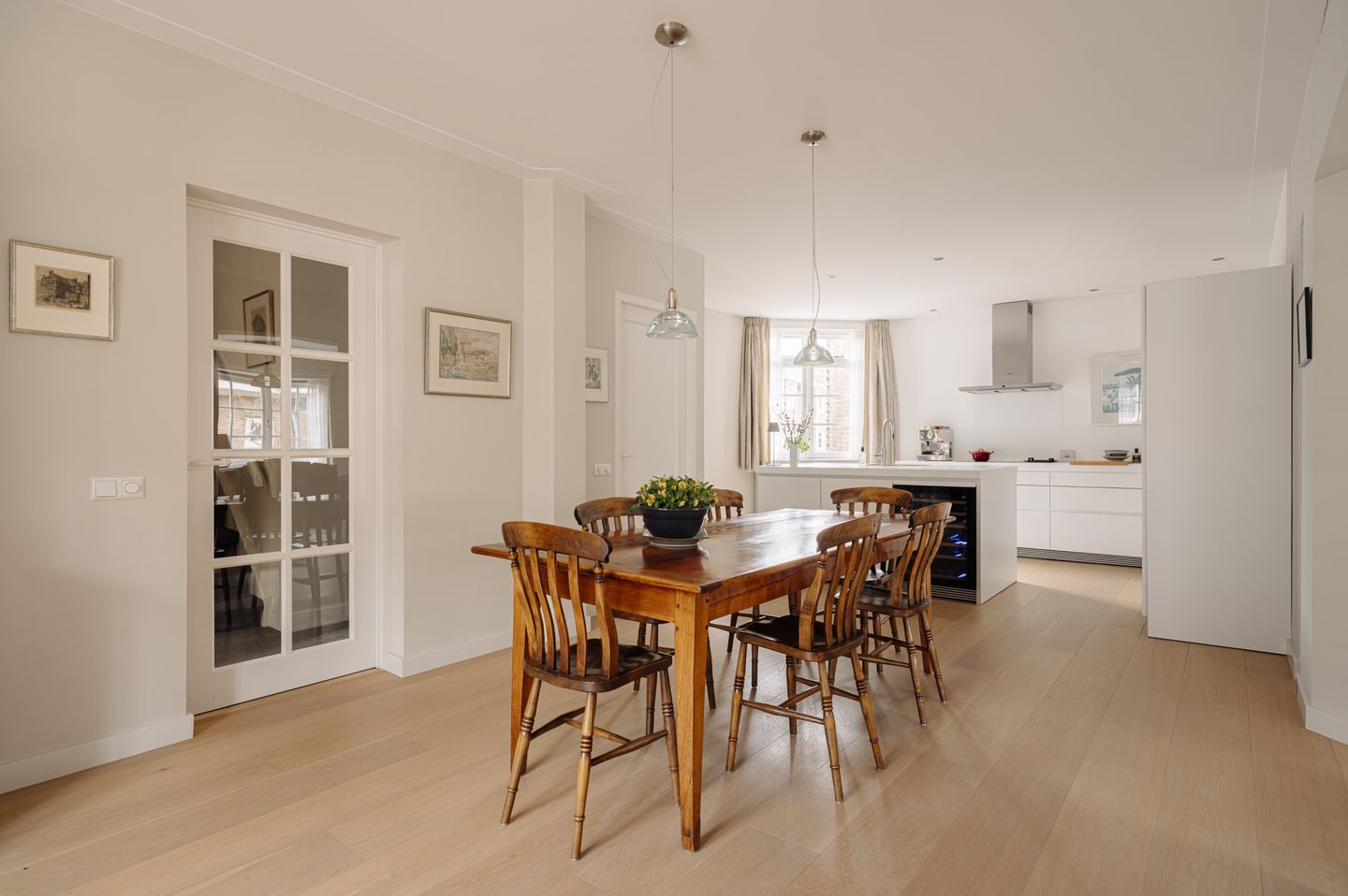 At the front is the sitting room. Thanks to its corner position and large windows, this is a bright space with views onto the street. The layout of this floor allows for multiple functions to coexist without compromising the cohesion of the space.