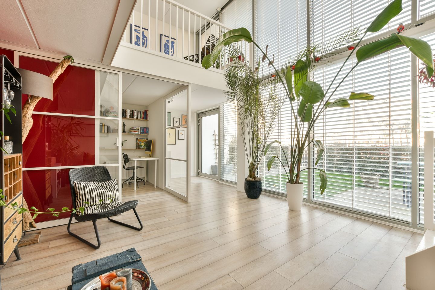 Op de begane grond is er een separate werkruimte. De grote ramen reiken tot de eerste verdieping, en zorgen voor veel lichtinval. De raambekleding bestaat uit elektrisch bedienbare lamellen.
