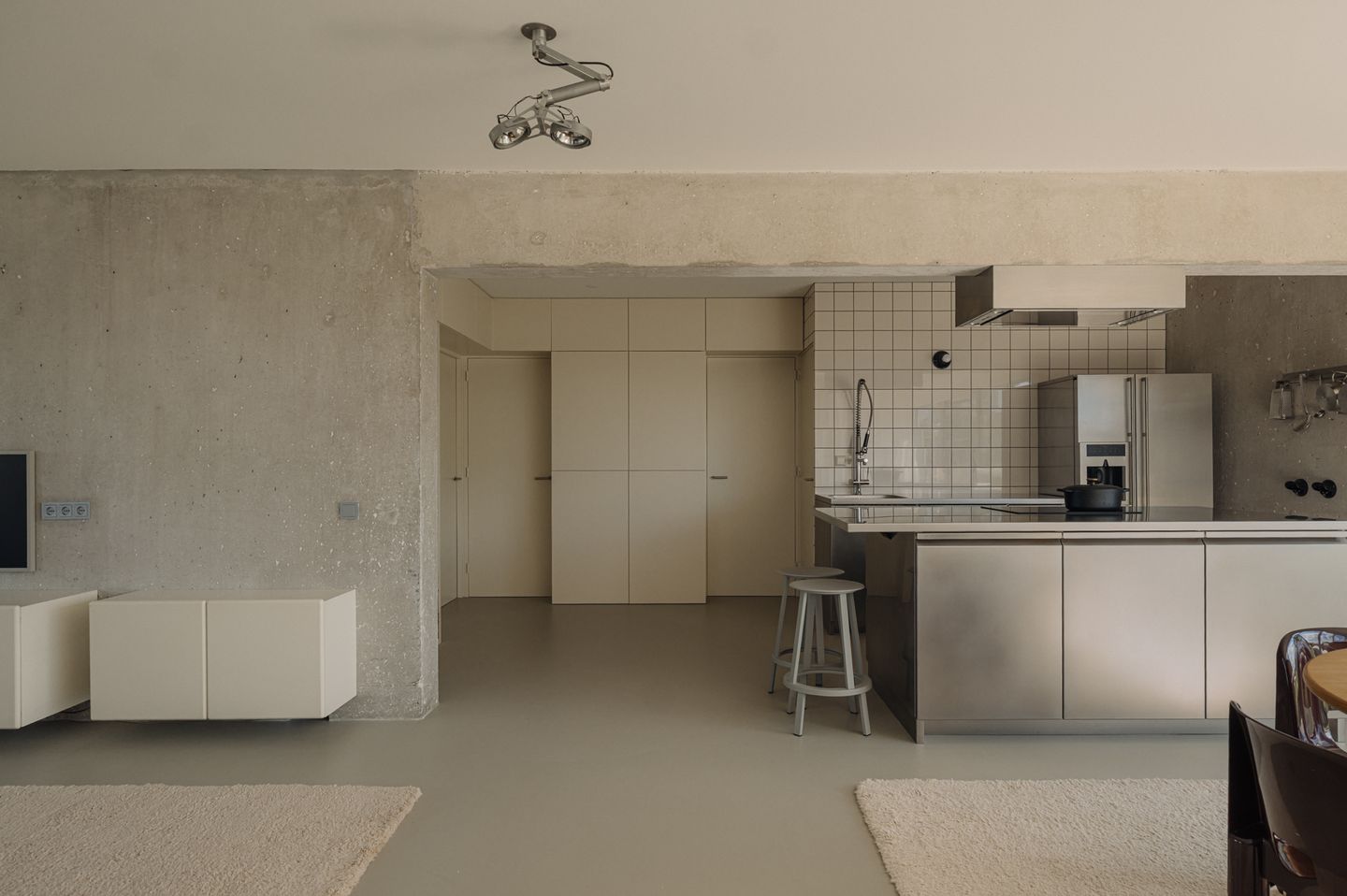 Het gehele appartement is uitgevoerd met een lichte gietvloer. De wanden zijn strak gestuct en recent wit gesaust. Op verschillende plekken is de originele betonstructuur zichtbaar gemaakt. Het appartement blinkt uit door de consistent doorgevoerde ontwerpkeuzes.