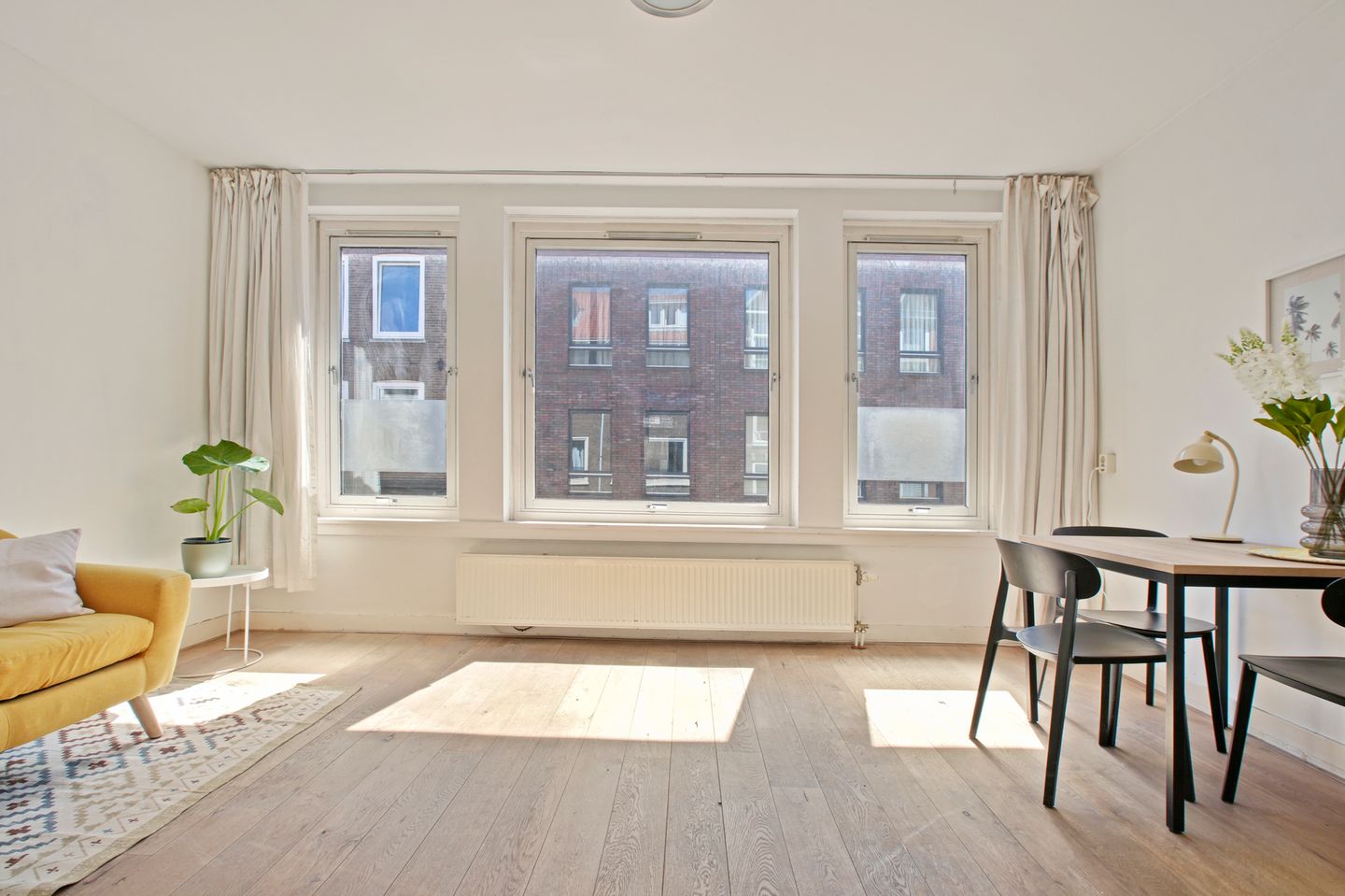 De woonkamer is het kloppend hart van het huis: een lichte, open ruimte met hoge plafonds en een prachtige houten vloer die warmte en karakter toevoegt. Het is een plek waar je op zonnige ochtenden kunt ontbijten aan de eettafel terwijl het licht over de vloer speelt, of 's avonds heerlijk onderuit zakt in je favoriete stoel met een goed boek. De inrichting laat zien hoe goed het appartement zich leent voor een minimalistische, maar knusse woonstijl.