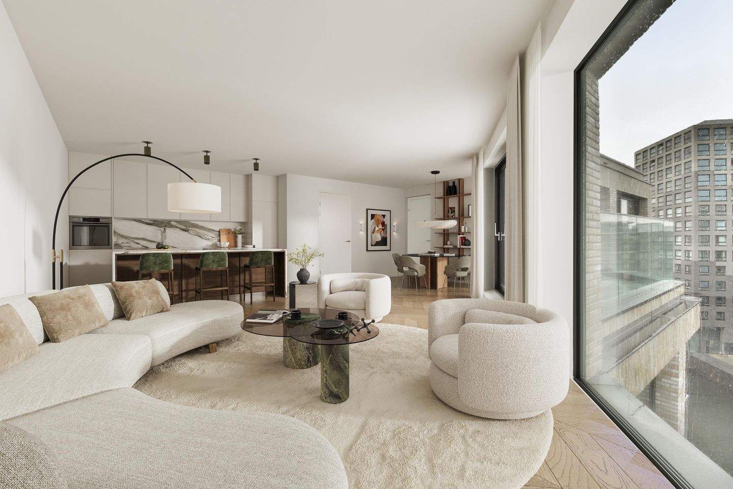 Aan het water, hoog boven de stad, wacht een appartement waar ruimte, rust en licht samenkomen.