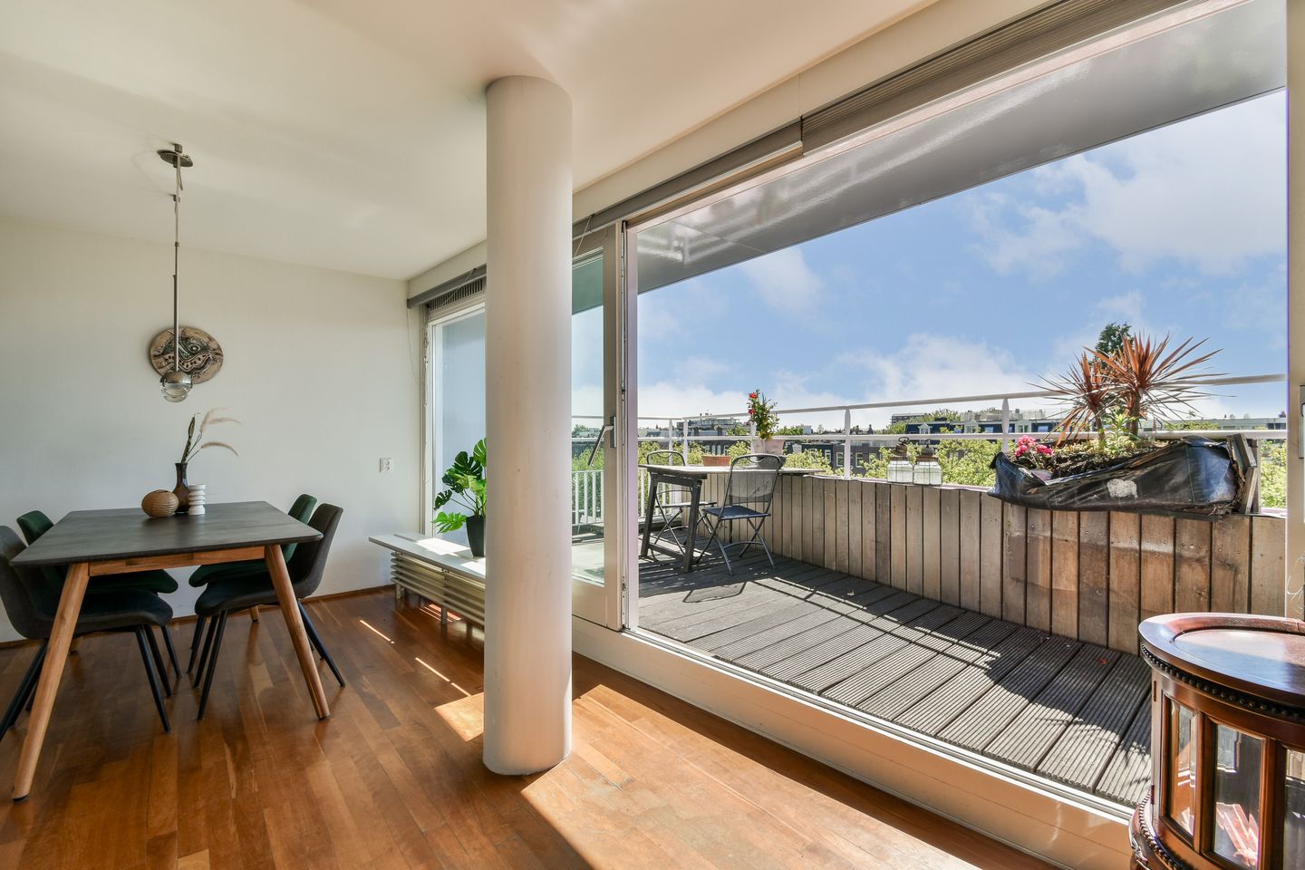 De woonkamer is ruim en licht. De combinatie van de donkere parketvloer en de sfeervolle houtkachel geeft een warme, knusse uitstraling. Via de schuifpui verleng je de woonkamer moeiteloos met het riante dakterras, dat een prachtig uitzicht biedt over het centrum van Amsterdam. Heerlijk om hier te barbecueën in het zonnetje. De woonkamer en dus ook het dakterras zijn gericht op het zonnige zuidwesten.