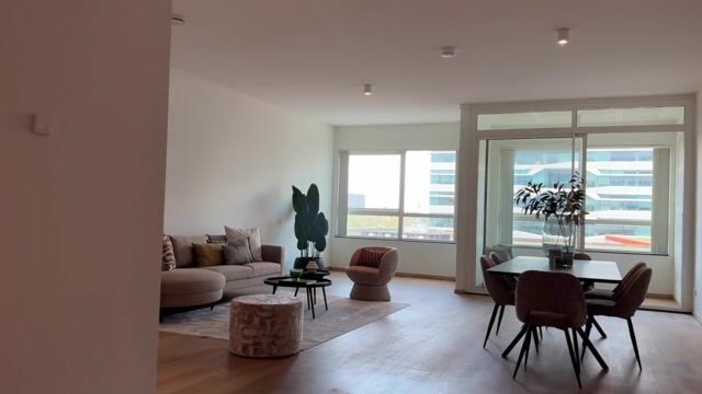 De woonkamer met grote raampartijen baadt in daglicht en biedt een prachtig uitzicht op de levendige Zuidas. De open keuken met kookeiland, uitgevoerd in natuursteen en voorzien van hoogwaardige inbouwapparatuur, vormt een uitnodigende plek om samen te koken en te dineren. Vanuit de woonkamer stapt u de eerste loggia op, ideaal gelegen op het westen voor een avondzon.
