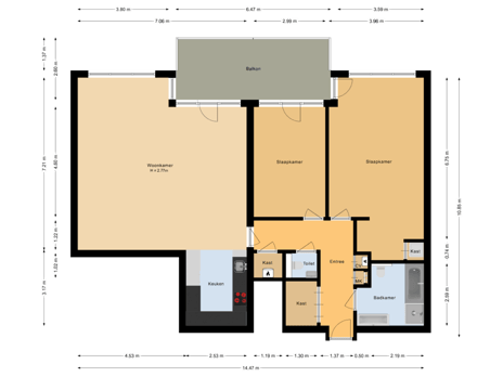 - 17 m² (2,60 meter diep en 6,47 meter breed)