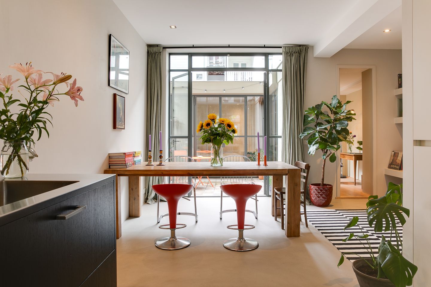 Het eetgedeelte ligt aan de achterzijde en grenst aan de patio. De eethoek biedt plaats aan een lange tafel om avonden lang met vrienden te dineren. Uiteraard kun je de opstelling ook precies omdraaien en het eetgedeelte aan de straat zijde maken en de woonkamer aan de achterzijde.