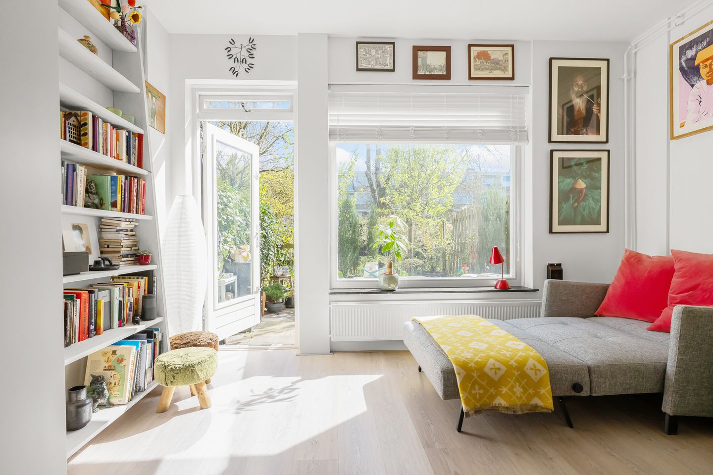 Adjacent to the kitchen is the cozy and bright living room, which provides access to the sunny garden.