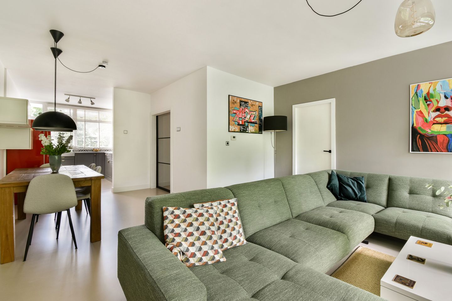 At the gallery side, you’ll find a sleek and efficiently laid-out kitchen. The practical L-shaped layout provides generous workspace and storage. The countertop features an elegant marble-look finish, and built-in appliances include a oven, induction cooktop with extractor, dishwasher, and washing machine. The retro fridge-freezer is from the brand Smeg.