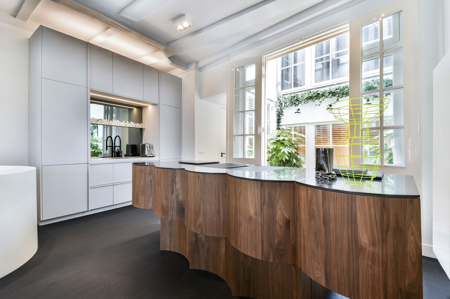 Through the entrance, you step into the bright, spacious kitchen-diner. At the front, a stylish lounge area offers phenomenal views over the Herengracht and Brouwersgracht – it doesn’t get more quintessentially Amsterdam. At the rear, the bespoke kitchen island with elegant scalloped fronts is equipped with an induction hob, combi oven, and generous storage drawers. The wall unit includes a sink, dishwasher, refrigerator, and ample storage, all in a timeless, sophisticated design.