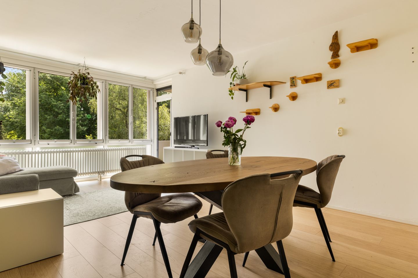 The apartment can be reached by elevator or stairs to the third floor. From the communal entrance, you enter the hallway, which provides access to the living room, bedroom, bathroom, and separate toilet. The living room is wonderfully bright thanks to the large windows and overlooks the beautifully maintained greenery of the Plan van Gool. From here, you step right onto the sunny balcony, facing the southeast.