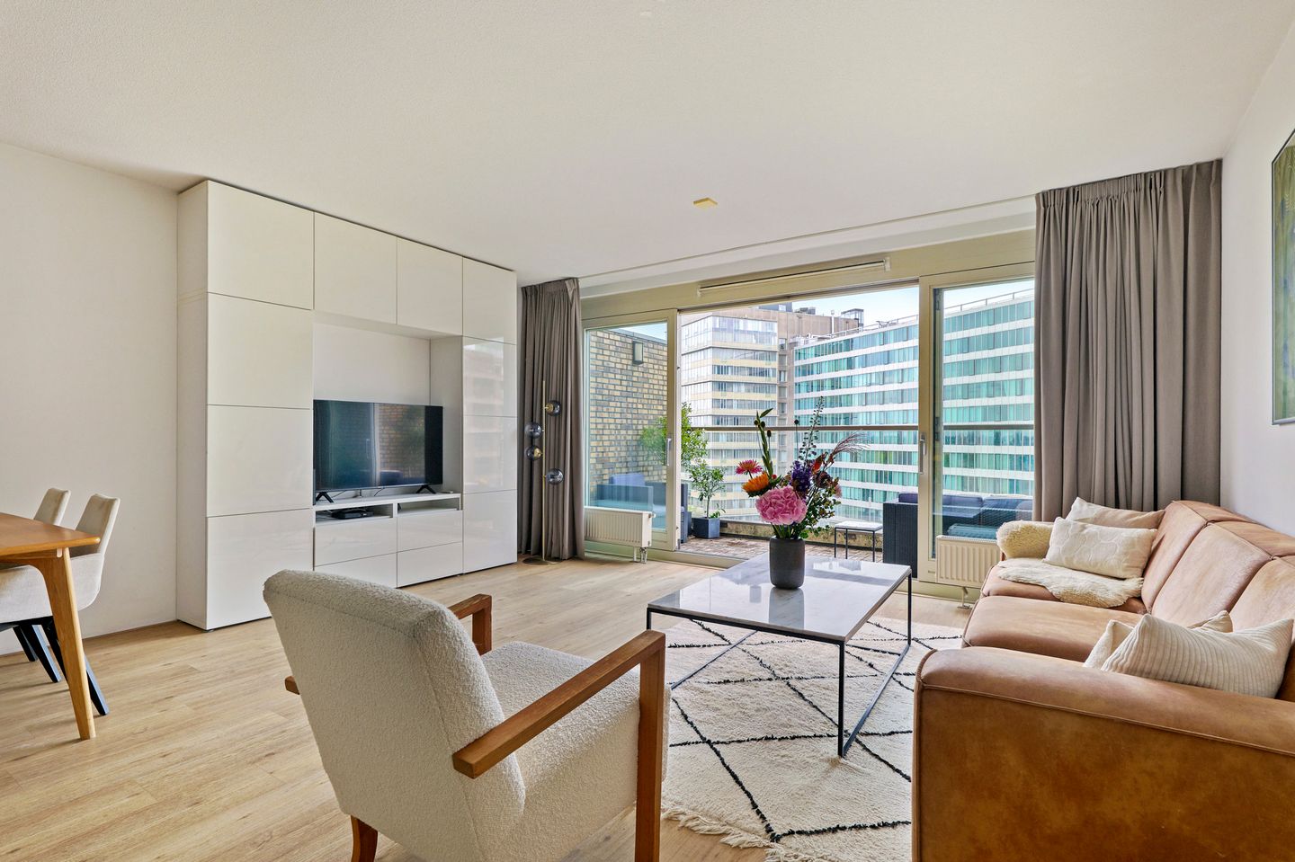 De woonkamer is geweldig licht door de grote glazen schuifdeuren die toegang bieden tot een royaal balkon van ca. 8m2 gelegen op het zuidwesten. Het is dan ook ontzettend fijn om na een lange dag werken op jouw eigen terras neer te ploffen en te genieten van een welverdiend glas wijn in de zon.