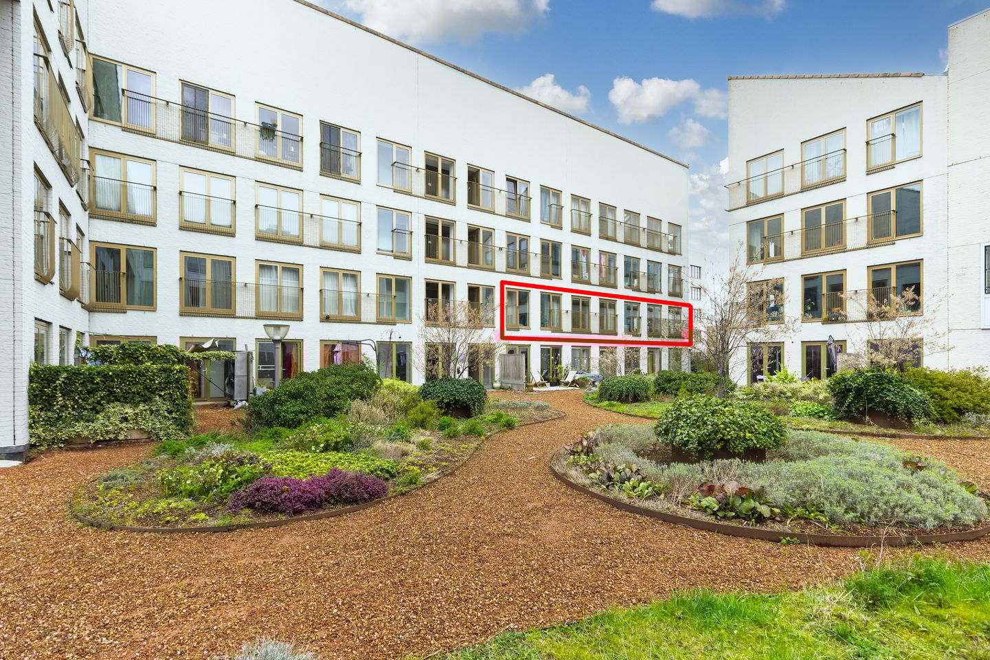 Via de gezamenlijke entree met lift en trappenhuis wordt het appartement op de eerste verdieping bereikt. De ruime hal met voldoende ruimte voor een garderobe en inbouwspots geeft toegang tot alle vertrekken van de woning. Vanuit hier zijn onder andere de ruime berging met wasmachineaansluiting en het moderne separate toilet met fonteintje bereikbaar. Aan het einde van de gang bevindt zich de royale woonkamer met open keuken. Deze ruimte valt direct op door de overvloedige lichtinval dankzij grote openslaande deuren met Franse balkons aan twee zijden en diepe vensterbanken. Het verlaagde plafond met inbouwspots en koofverlichting zorgt voor een verzorgd en doordacht lichtplan. De luxe keuken bestaat uit hoge kasten met houtlook fronten, waartussen een werkblad met spoelbak en ruimte voor keukenapparatuur is opgenomen. Dit wordt gecombineerd met een kookeiland met witte fronten en een keramisch werkblad. De keuken is uitgerust met Miele-apparatuur, waaronder twee grote koelkasten met vriesvak, een stoomoven, combi-oven en vaatwasser. Het kookeiland biedt veel opbergruimte, beschikt over een strak geïntegreerde inductiekookplaat met afzuigkap en biedt plaats voor barkrukken. Vanuit de woonkamer is er fraai uitzicht op de onder architectuur aangelegde, afgesloten binnentuin. De twee slaapkamers zijn royaal van formaat, circa 14 m² en 19 m². Beide kamers beschikken over veel daglicht door grote openslaande deuren met Franse balkons en zijn voorzien van inbouwspots. Voor de ramen bevinden zich verhoogde, diepe vensterbanken. De grootste slaapkamer kan desgewenst worden opgesplitst, waardoor een derde slaapkamer gerealiseerd kan worden. De moderne badkamer is eveneens vanuit de hal toegankelijk en is voorzien van een ligbad, wastafel en een ruime inloopdouche met regendouche. Daarnaast is er een handdoekradiator aanwezig en valt er veel daglicht binnen door het gerealiseerde binnenraam. Tot slot beschikt het appartement over een eigen berging en een parkeerplaats in de ondergelegen beveiligde parkeergarage.