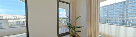 Entree met hal die toegang geeft tot alle vertrekken. De lichte woonkamer heeft door de hoekligging ramen aan twee zijden, wat zorgt voor een prettige en open sfeer. De moderne open keuken is uitgerust met diverse inbouwapparaten. Vanuit de woonkamer stap je zo het brede balkon op, gelegen op het zuidoosten — perfect om al vroeg in het jaar van de zon te genieten.