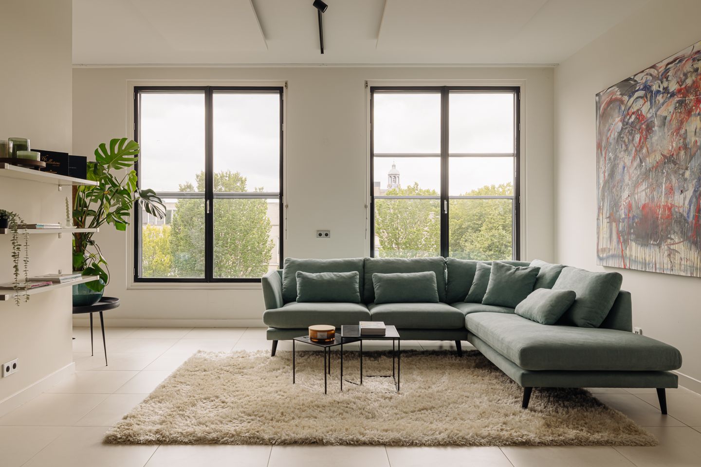 Via de nette centrale entree bereikt u per lift de woning op de vierde verdieping. De hal biedt toegang tot een separaat toilet en leidt naar de indrukwekkende, lichte living met bijna kamerhoge ramen en een plafond van bijna 3 meter hoog. De open woonruimte is verdeeld in een sfeervolle zit- en eetkamer, gescheiden door een half open wand die voor extra intimiteit zorgt.