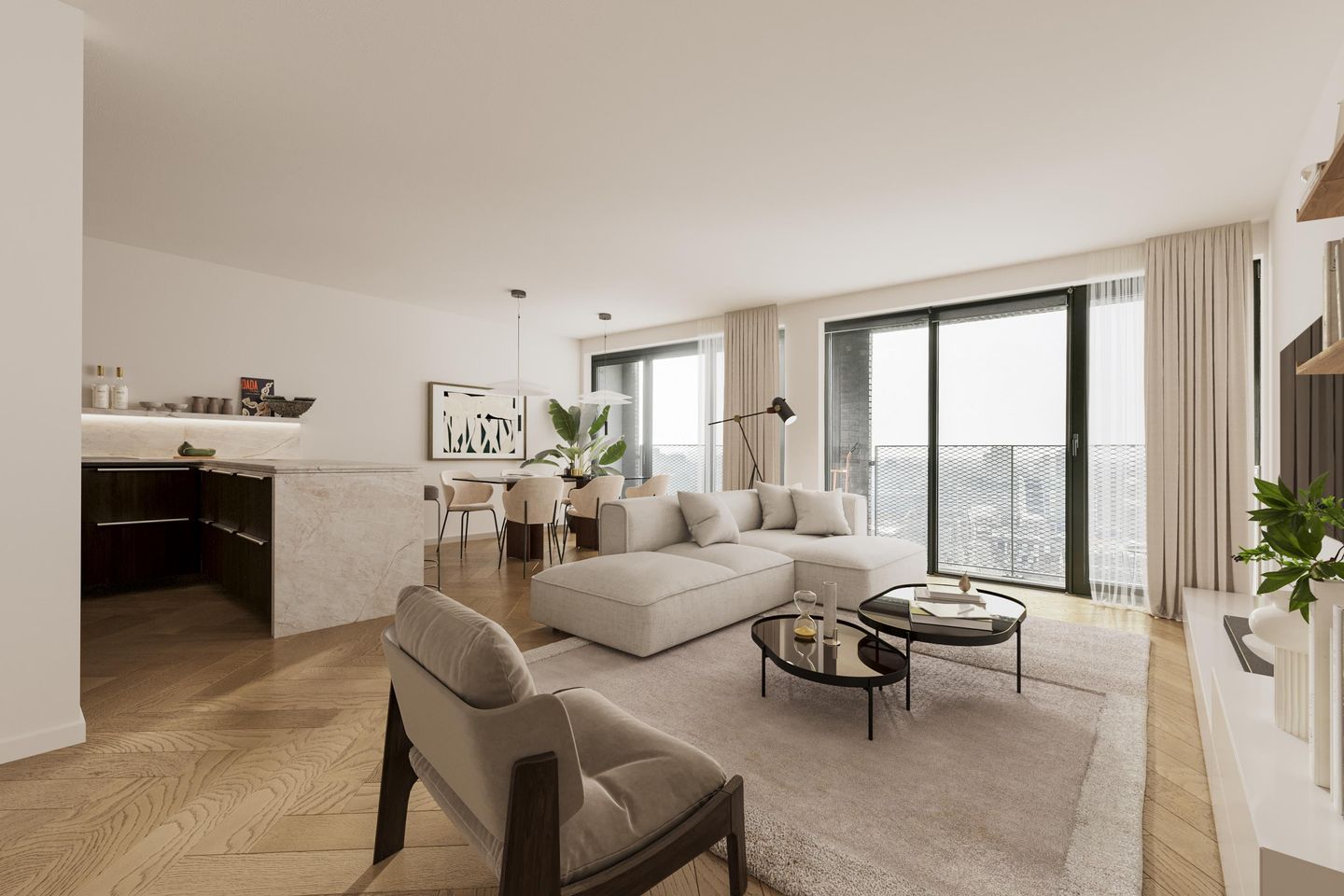 The large bright living room with open kitchen offers a fantastic view of the city. The living room has a narrow balcony that is accessible via the sliding door. By opening this door you bring the outside in.