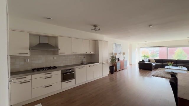 De lichte en bijzonder ruime woonkamer is direct een indrukwekkende binnenkomer. Met een oppervlakte van circa 70 m² biedt deze kamer enorm veel ruimte. De open keuken vormt samen met de woonkamer een perfecte setting voor gezellige avonden. De nette laminaatvloer met vloerverwarming draagt bij aan het comfort. Vanuit de woonkamer heb je een prettig uitzicht op de omgeving.
