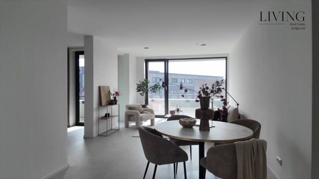 De woonkamer - met een heerlijk breed balkon - staat in open verbinding met de halfopen keuken, uitgevoerd met hoogwaardige inbouwapparatuur en een strak, tijdloos design. Grote raampartijen zorgen voor veel daglicht en versterken het gevoel van ruimte.