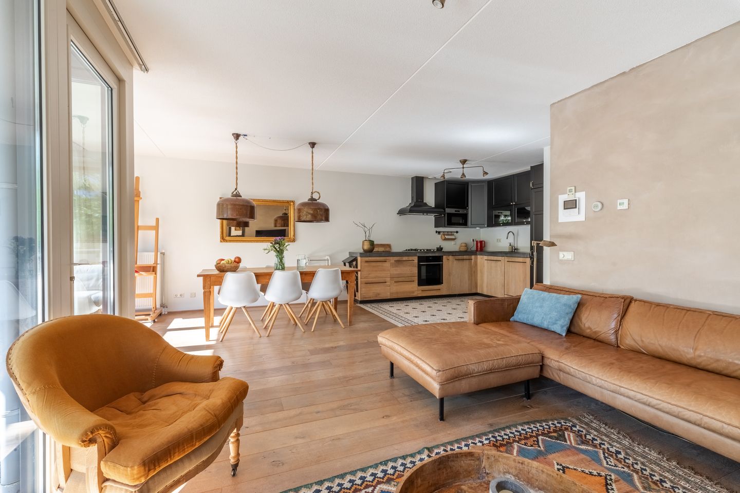 In de slaapkamers, woonkamer en gang ligt een verouderde rustieke eikenhouten vloer die warmte en karakter toevoegt aan de woning. Via de openslaande deur bereik je het zonnige balkon op het zuidwesten – een heerlijke plek voor een kop koffie of een ontspannen middag. De royale en lichte woonkamer biedt een open uitzicht.