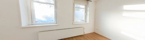 Brede en lichte woonkamer met drie grote ramen op het zuidwesten. Door de hoekligging valt hier gedurende de dag veel zonlicht binnen. De laminaat vloer geeft de kamer een warme en moderne uitstraling.