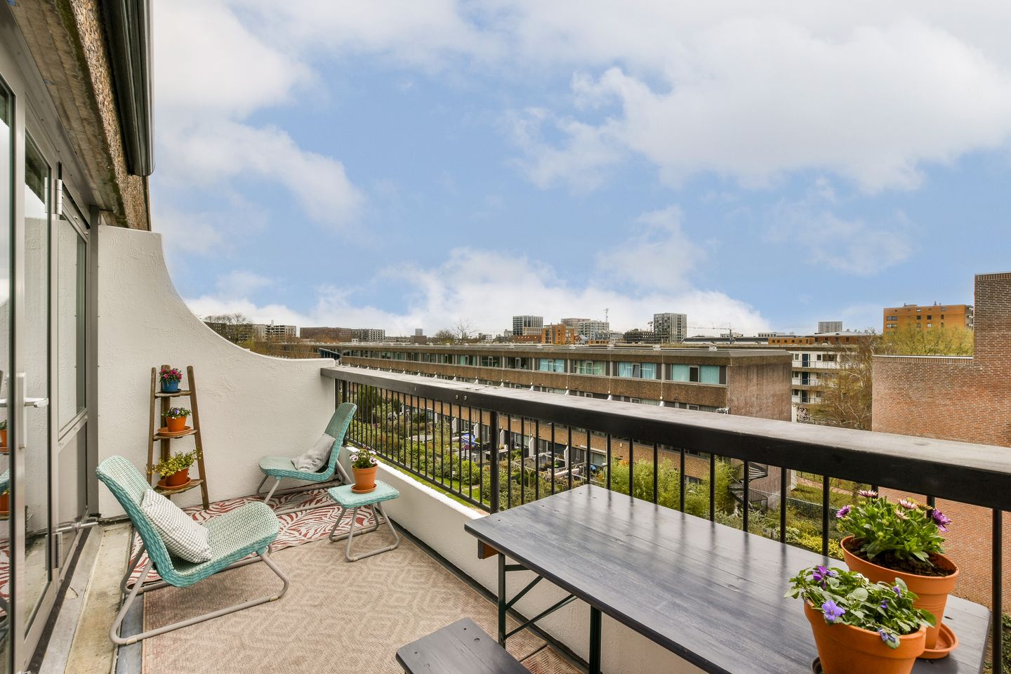 -Vanuit het terras mooi uitzicht over de gemeenschappelijke binnentuin en o.a. Molen de Gooyer.