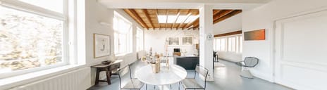 De entree van het appartement bevindt zich op de tweede verdieping. Vanuit de entreehal kom je in de lichte en sfeervolle woonkamer. De zichtbare balkenconstructie en de brede raampartijen van ruim 10 meter breed vallen direct op: een overvloed aan natuurlijk licht gedurende de dag.